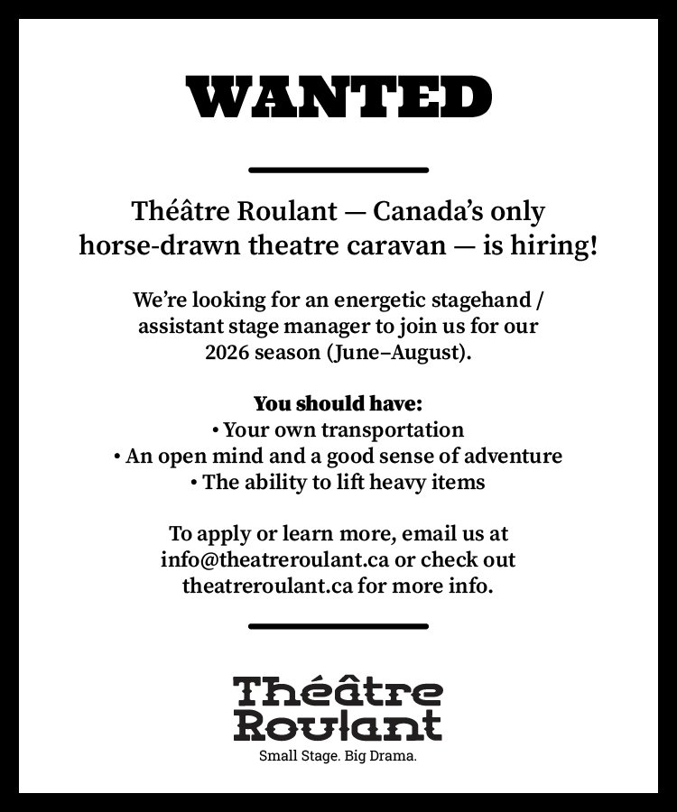 If you think this position is for you, please email us at info@theatreroulant.ca.